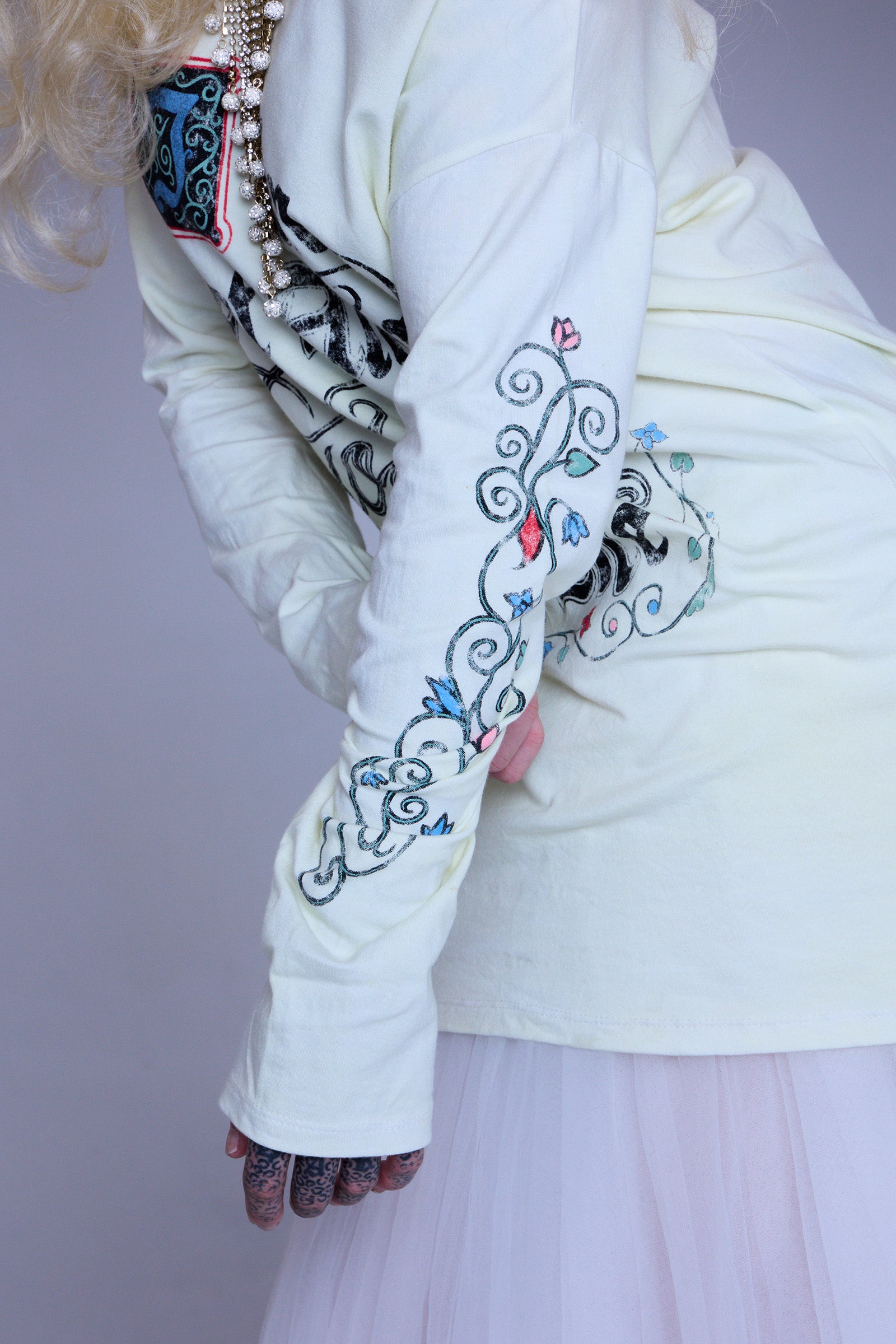 Off the shoulder long sleeve t-shirt dress, oversize fit, color graphic print on left sleeve