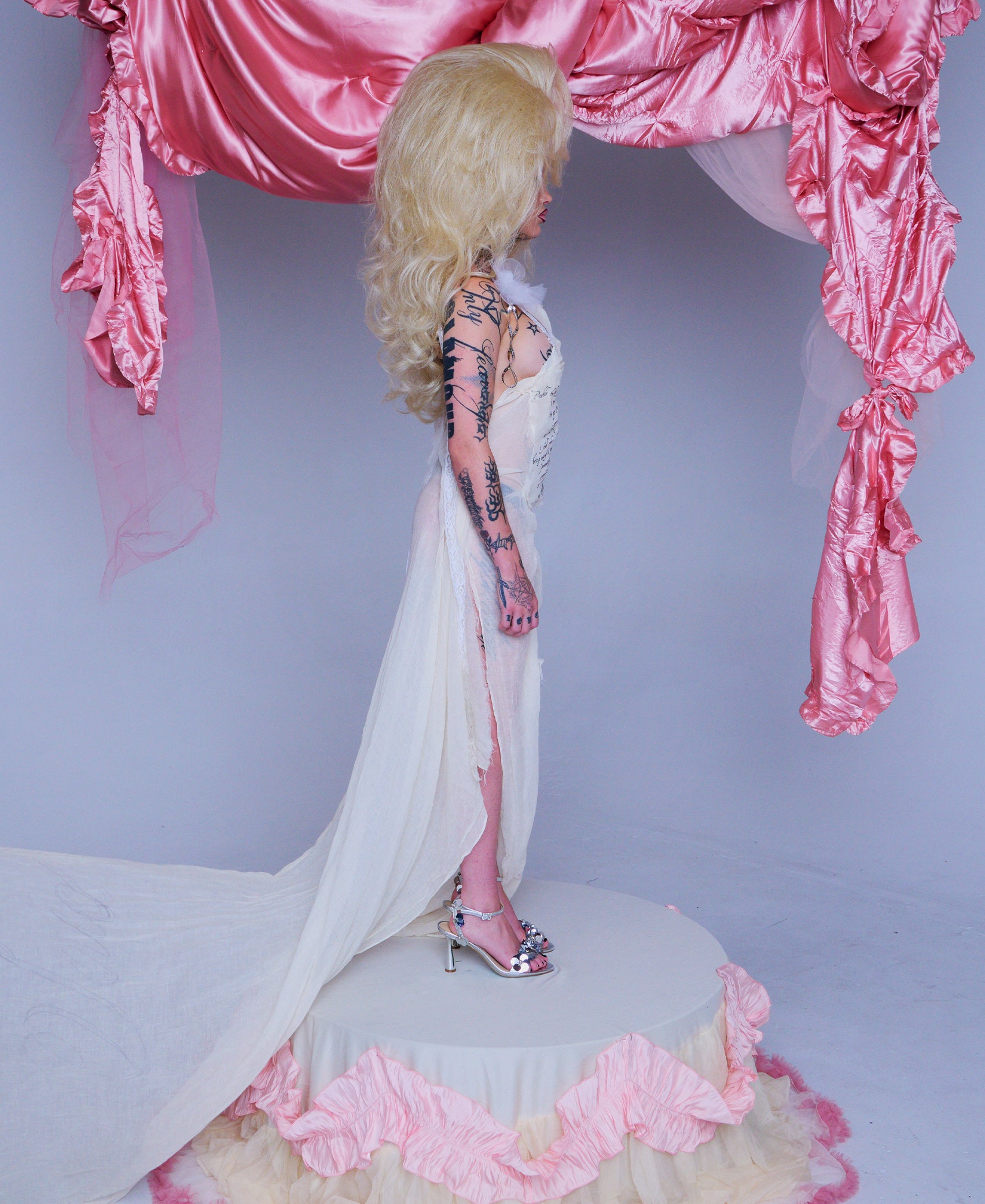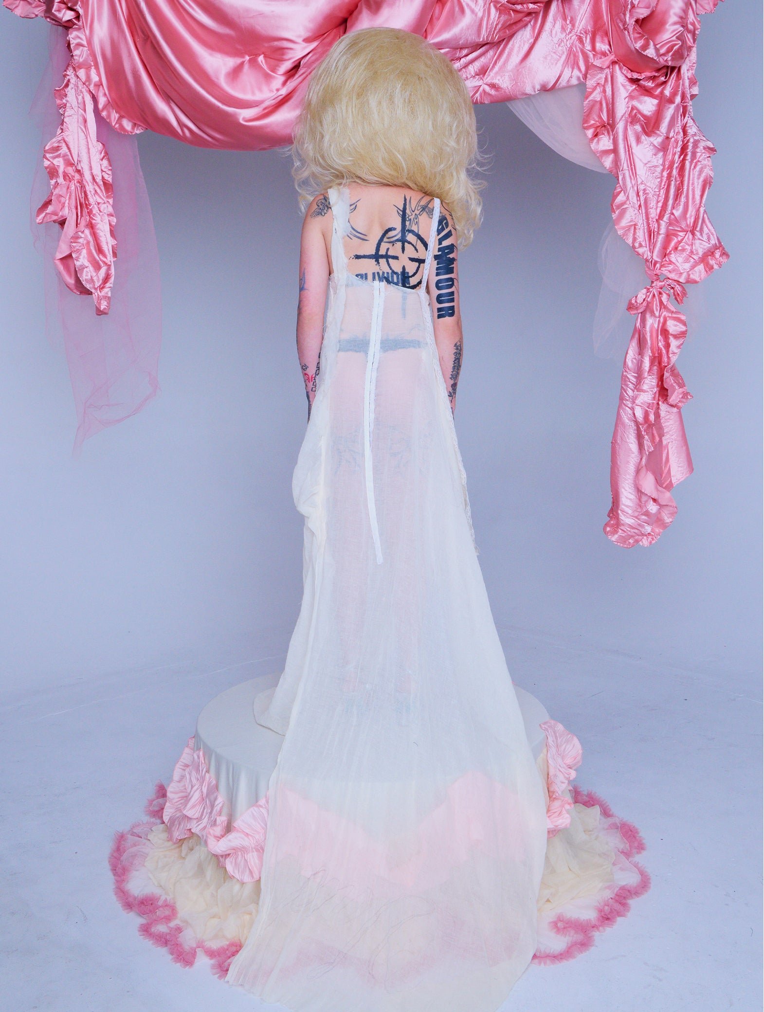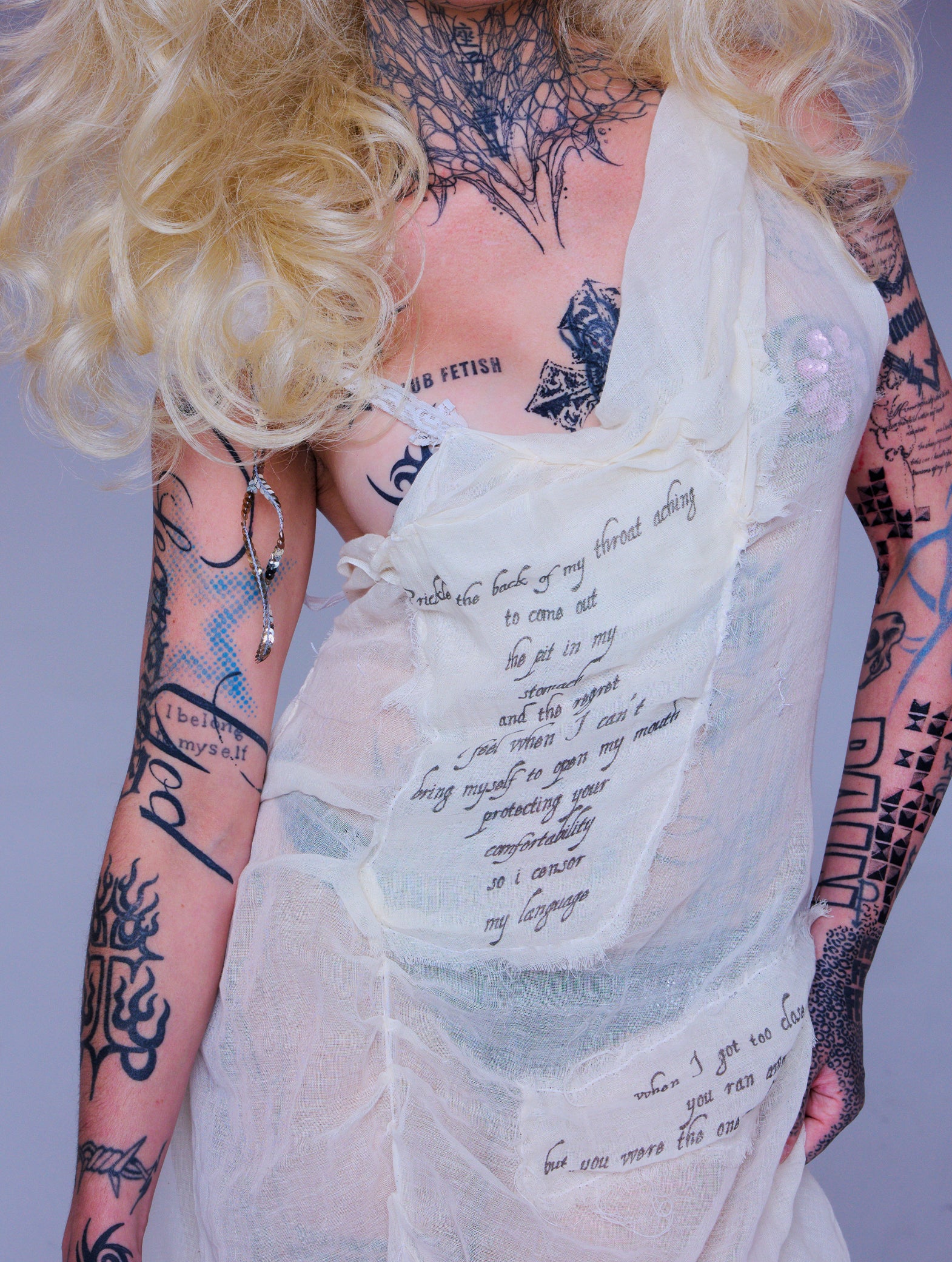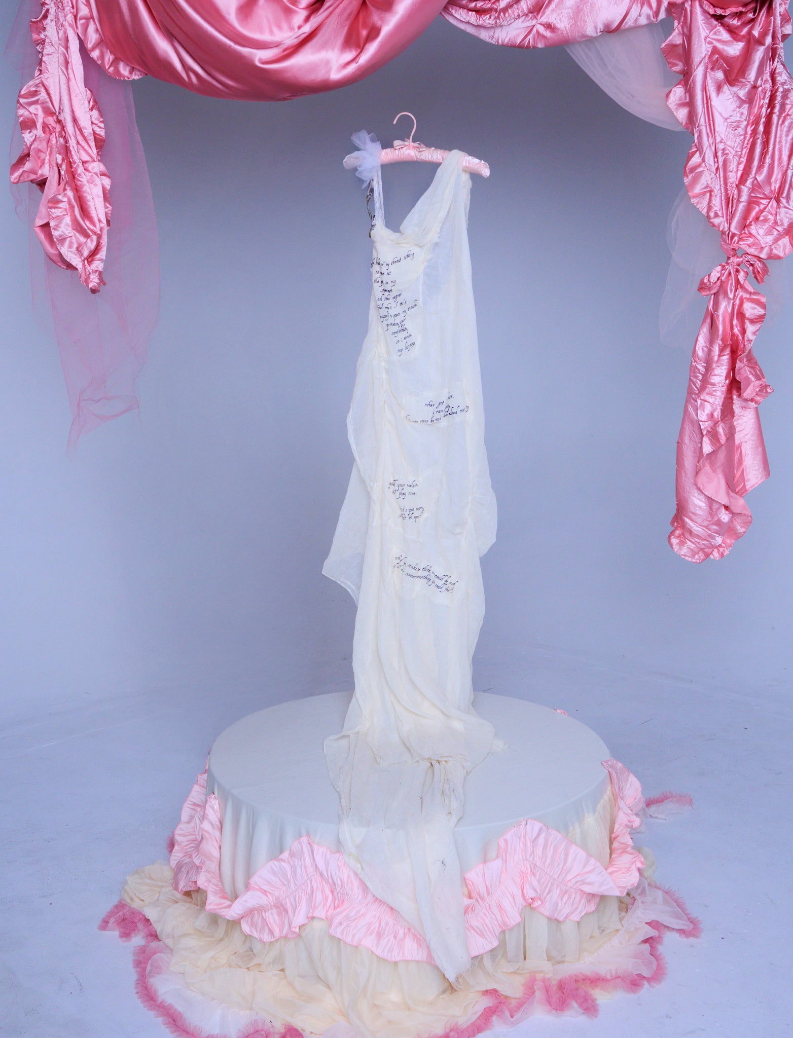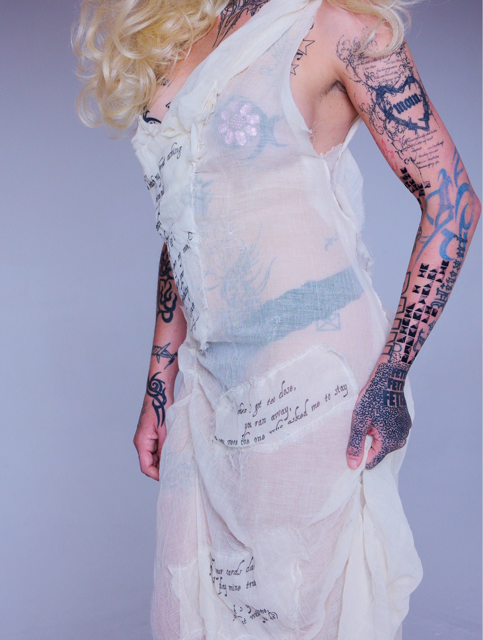 Hand-sewn sheer light weight muslin, long train in back, with direct to garment printed poetry along the front of the dress.